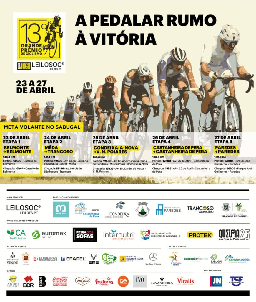Esta quarta-feira, dia 23 de abril, o concelho do Sabugal acolhe a passagem da 1.ª etapa do Grande Prémio de Ciclismo ‘O Jogo’, nomeadamente uma meta volante (em frente ao Tribunal – 14h50).