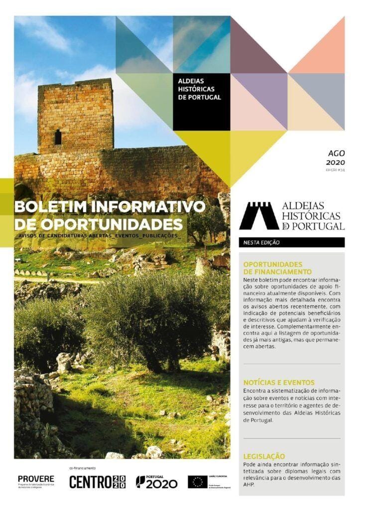A edição de agosto de 2020 do Boletim de Oportunidades apresenta o descritivo de todas as oportunidades disponíveis atualmente para candidatura, podendo, neste contexto, analisar o aviso que melhor se adequa à sua intenção de investimento sinalizado no Programa Ação do PROVERE Aldeias Históricas de Portugal para formalização da respetiva candidatura, bem como ter acesso às medidas disponíveis para apoio a empresas e instituições em resultado da situação provocada pela pandemia.