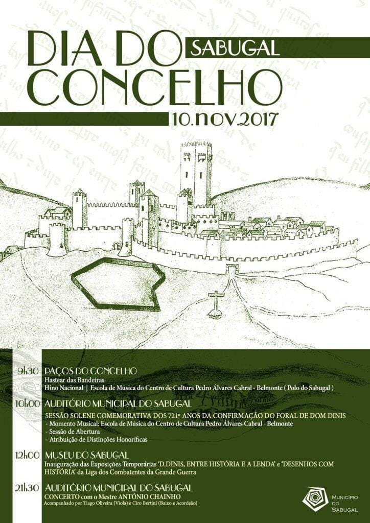 O Concelho do Sabugal, celebra, dia 10 de novembro de 2017, sexta-feira, 721 anos da confirmação do Foral de D. Dinis. Para assinalar a efeméride, a Câmara Municipal do Sabugal delineou um programa que inclui Sessão Solene e um Espetáculo, à noite, com o Mestre António Chainho, acompanhado por Tiago Oliveira (viola de fado) e Ciro Bertini (baixo e acordeão). Também, nesse dia, a Autarquia inaugurará as Exposições Temporárias, “D. Dinis, entre a História e a Lenda” e “Desenhos Com História”, da Liga dos Combatentes da Grande Guerra.