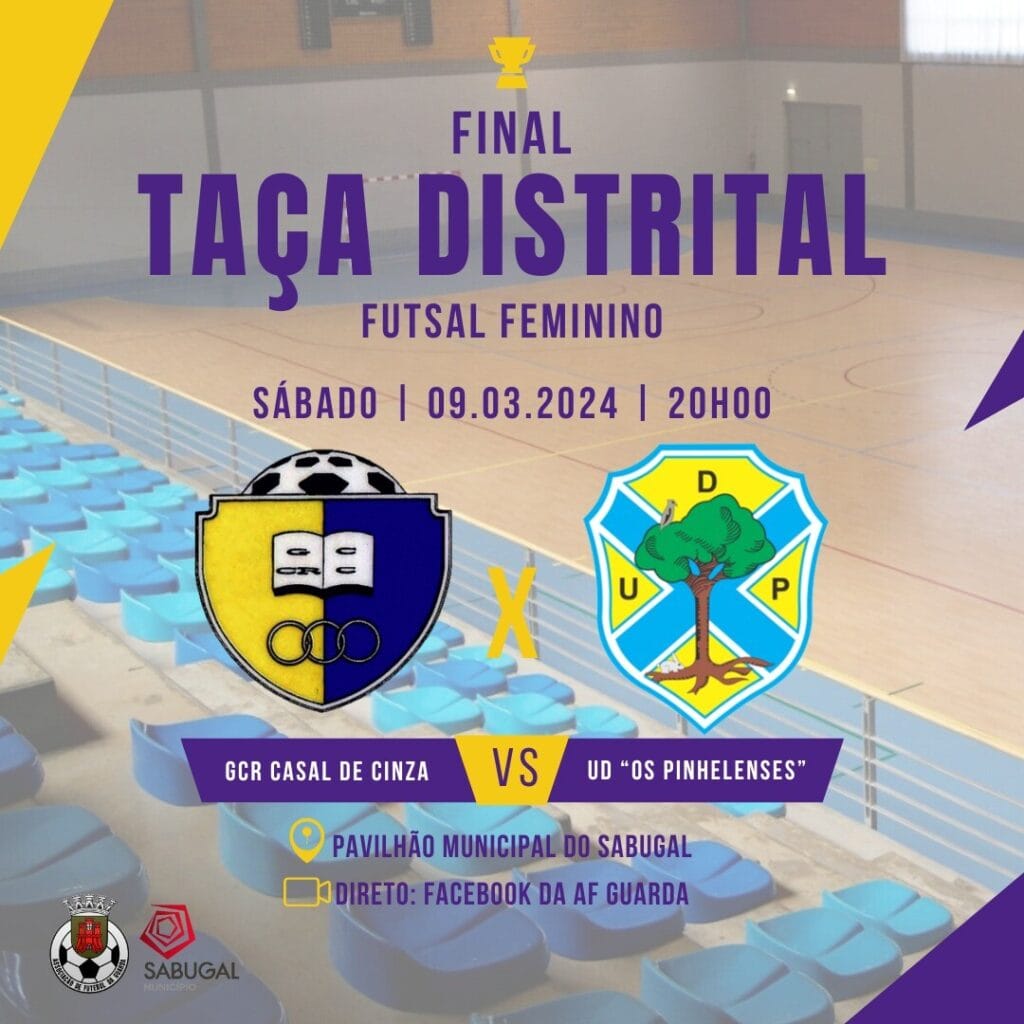 No dia 9 de março, às 20 horas, o Pavilhão Municipal do Sabugal recebe a Final da Taça Distrital de Futsal Feminino, da Associação de Futebol da Guarda, entre o Grupo Cultural e Recreativo de Casal de Cinza e a União Desportiva ‘Os Pinhelenses’.