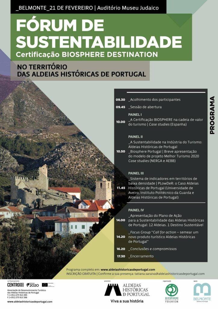 A Associação Aldeias Históricas de Portugal (AHP), em parceria com a Biosphere Portugal, promove no dia 21 de fevereiro, às 9h30, no Auditório do Museu Judaico em Belmonte, o Fórum de Sustentabilidade no Território das Aldeias Históricas de Portugal.