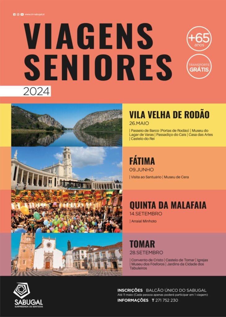 Vila Velha de Rodão (26 de maio), Fátima (9 de junho), Quinta da Malafaia (14 de setembro) e Tomar (28 de setembro) são os destinos deste ano. As inscrições estão a decorrer até ao próximo dia 11 de maio, no Balcão Único, sendo que os interessados podem participar, exclusivamente, numa das viagens em que a Câmara Municipal assegura o respetivo transporte.