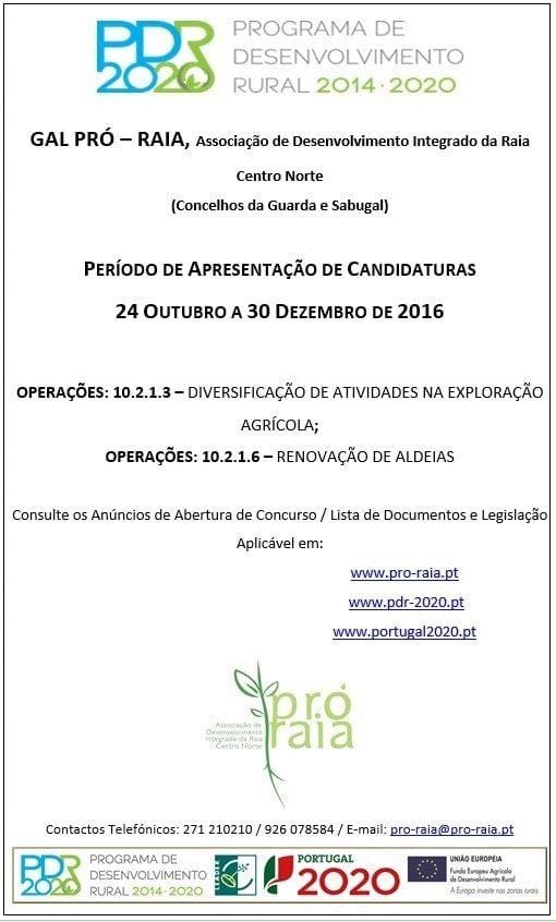 Enquanto Grupo de Ação Local com intervenção nos concelhos da Guarda e do Sabugal, a Pró-Raia – Associação de Desenvolvimento Integrado da Raia Centro Norte informa que, no âmbito do Programa de Desenvolvimento Rural (PDR) 2020, está aberto o período de apresentação de candidaturas às seguintes operações: