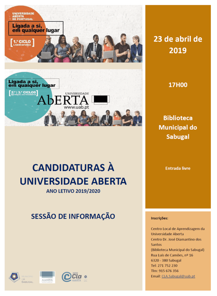 O Centro Local de Aprendizagem da Universidade Aberta (UAb) do Sabugal realiza no dia 23 de abril, pelas 17 horas, na Biblioteca Municipal, uma sessão de informação para candidaturas referente ao ano letivo 2019/2020.