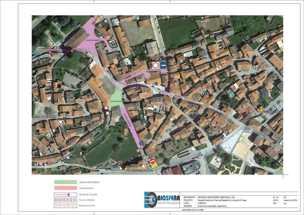 A Câmara Municipal informa que, tendo em consideração o desenvolvimento dos trabalhos integrados na empreitada de ‘Requalificação da Praça da República e Largo de São Tiago’, que se insere no Plano de Ação de Regeneração Urbana (PARU) do Sabugal, torna-se necessário proceder ao corte de trânsito rodoviário na Praça da República e condicionamento na Avenida das Tílias, conforme Plano de Sinalização Temporária (Fase 3). A interrupção ocorrerá pelo tempo estritamente necessário.